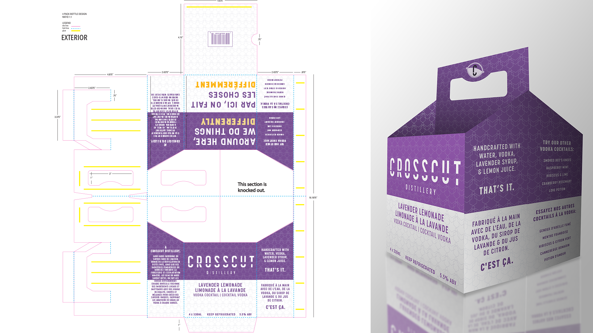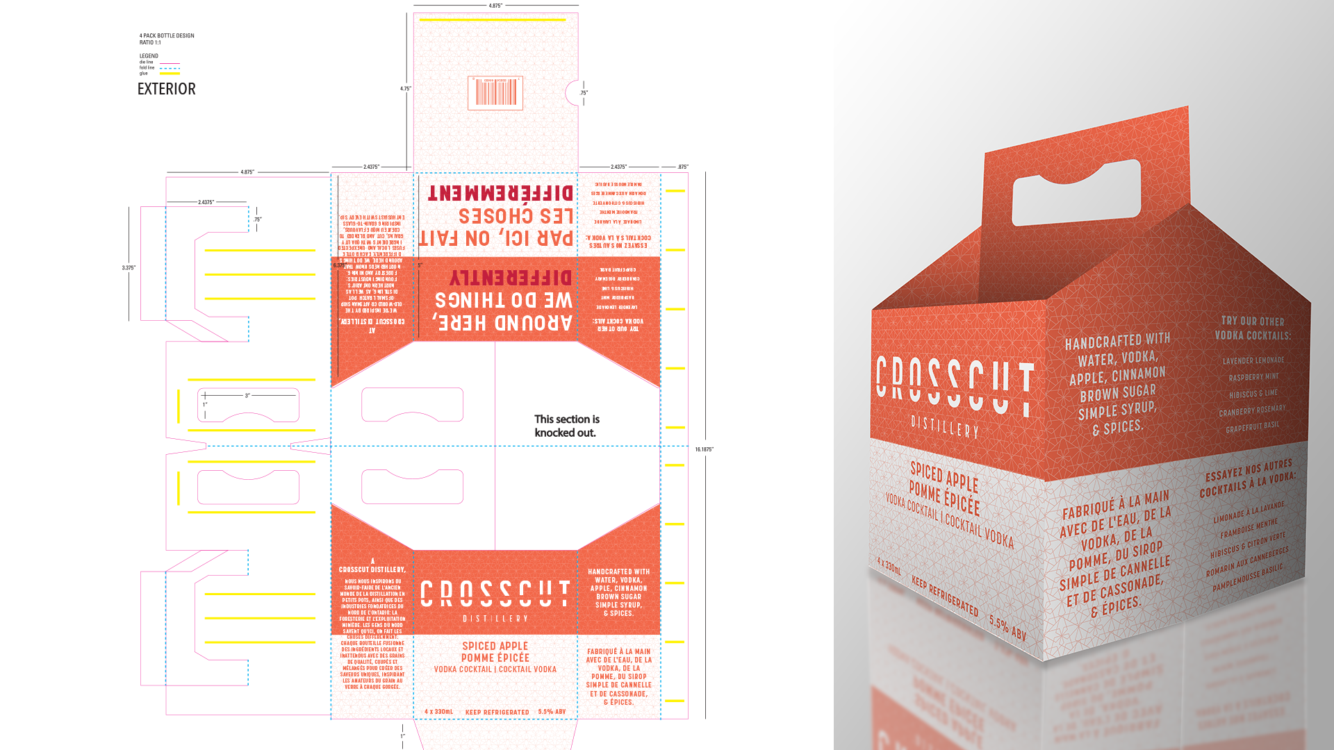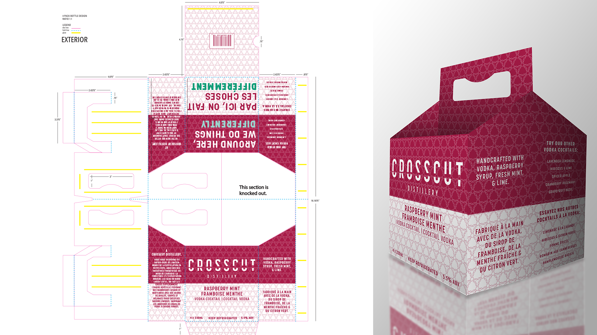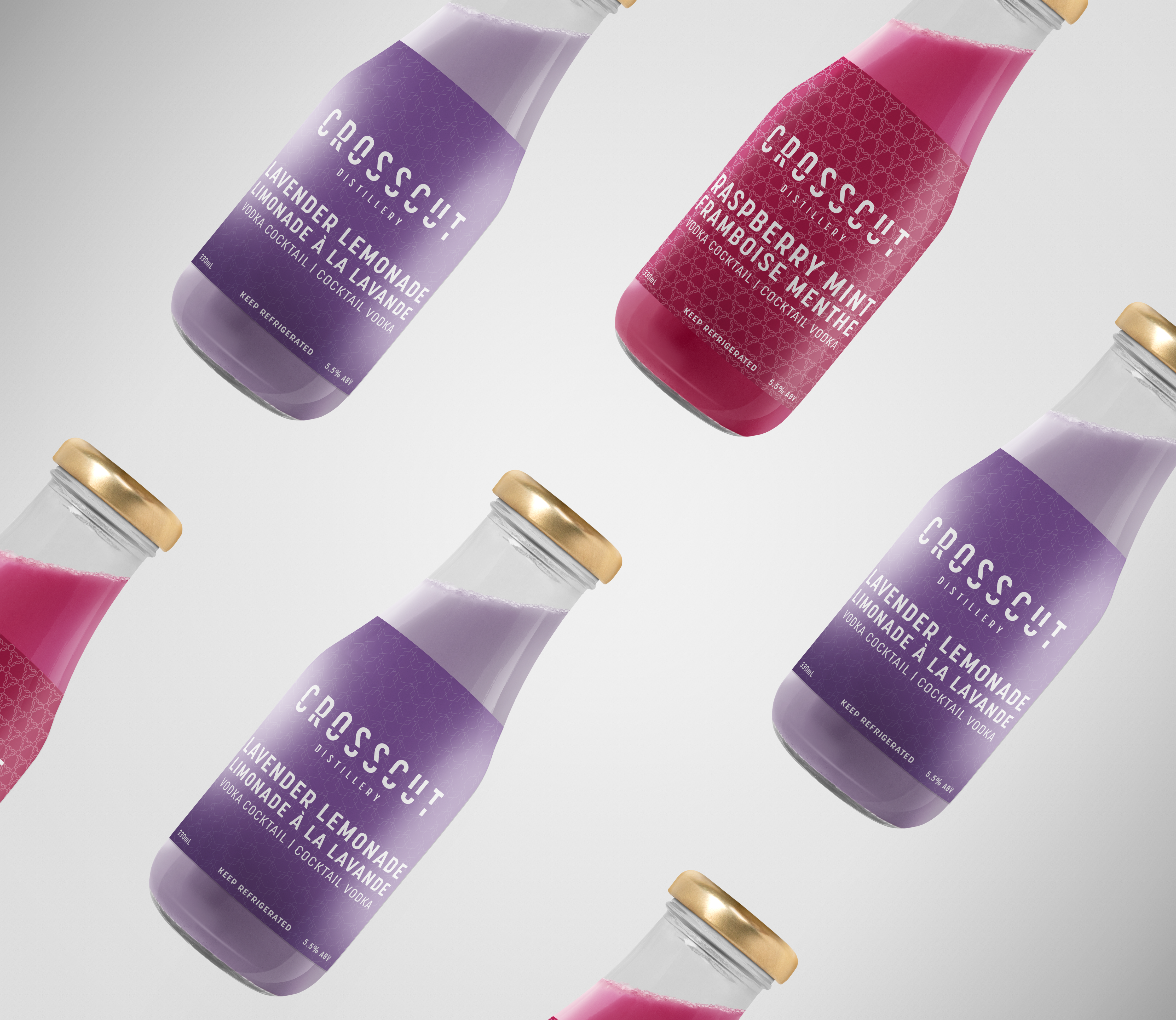 While the rest of their alcoholic beverages are sold by the bottle, Crosscut Distillery’s iconic vodka cocktails are currently sold in pouches. This can make them feel like an inferior product compared to the rest of Crosscut’s lineup, which could deter potential customers from trying the cocktails out. This project replaces the pouches with traditional glass bottles and carriers, which use bright colours and eye-catching patterns to make them pop out on store shelves.